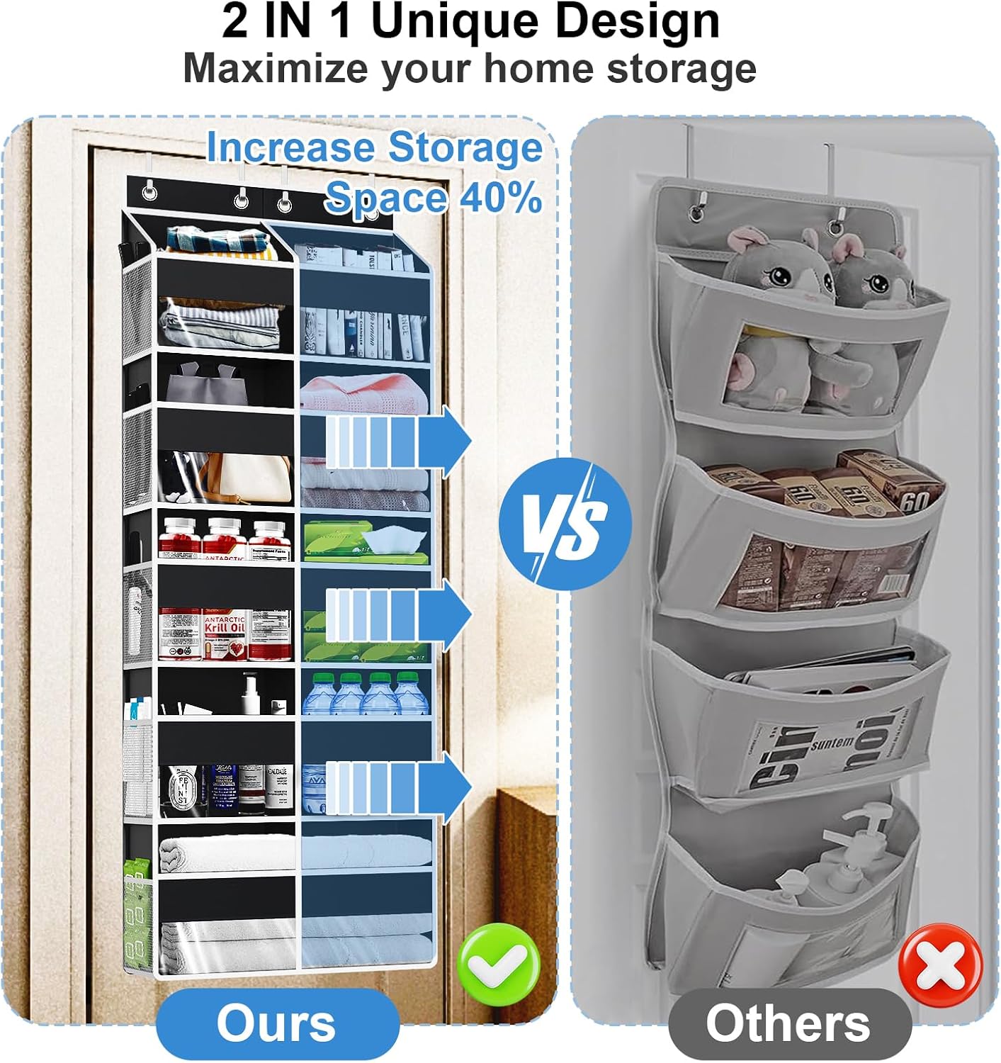 Heavy Duty Load-Bearing Capacity & No Tilting:Our over door organizer features reinforced stitching between each side pocket, and built-in strengthened side cardboards and bottom cardboard,easily to hold 80lb weight,without deforming and NO tilting. More reasonable dimension design (*20”(Width) X 56.9”(Height) X 6.9”(Deep)make it close to bedroom door tightly,don't move or sway although open or close the door
