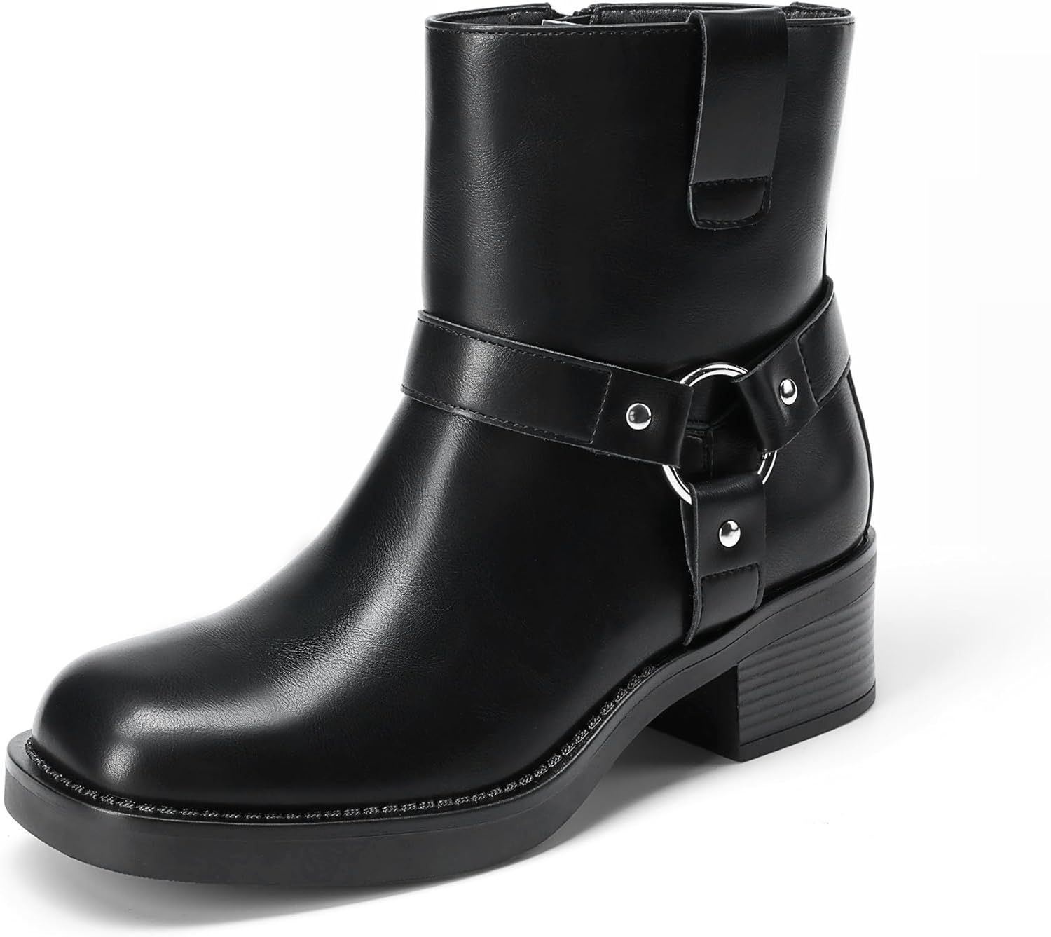 DREAM PAIRS Women's Ankle Booties Side Zipper Motorcycle Boots Square Toe Chunky Low Heel Fashion Buckles Biker Riding Boots