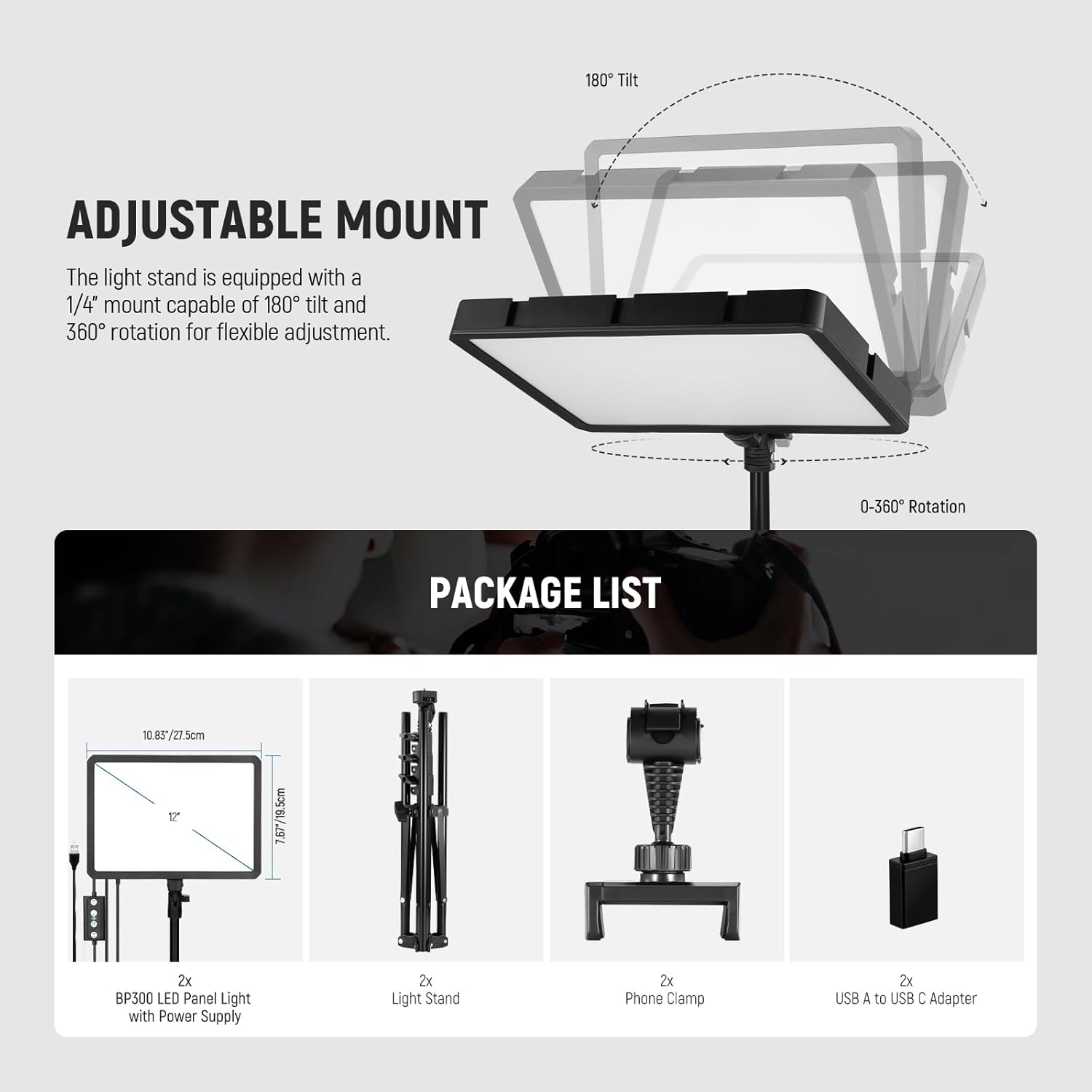 【Integrated Power & Control Cable】 The slim LED light panel, 1.01''/2.8cm thick, is compact and easy to carry around. It comes with a 78.7"/2m USB power cable integrated with a lighting controller for easy use. Powered via 5V/2A USB input, it works with USB wall adapters, power banks, desktop PCs, or laptops using the included USB A to USB C adapter, ideal for flexible setups at home or on the go