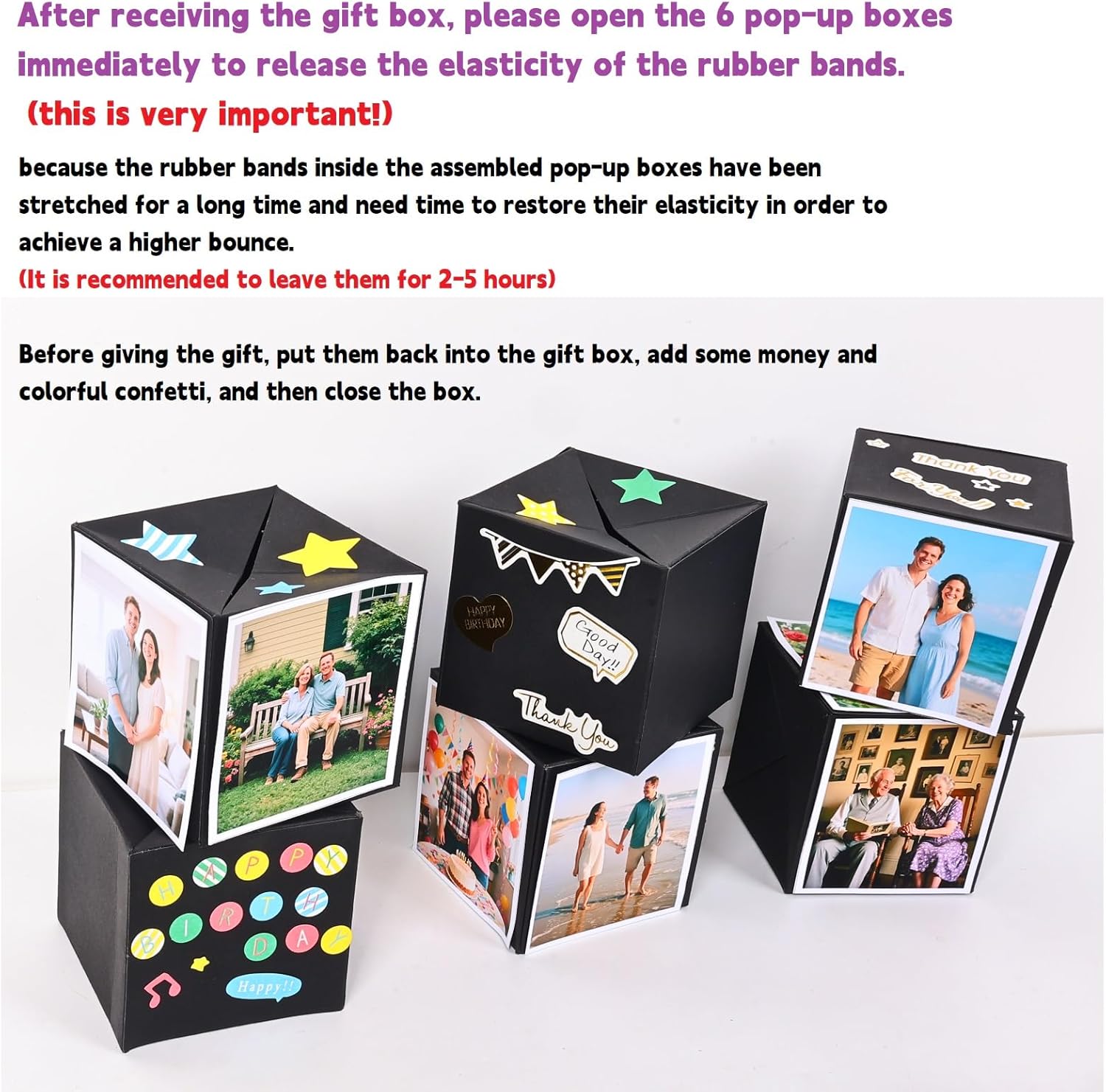 【Ready to Gift Instantly】:​ This pop-up gift box arrives ​pre-assembled!​​ We've done the hard work for you, eliminating complex setup. Just place your cash inside and decorate with your photos and stickers for a personalized touch