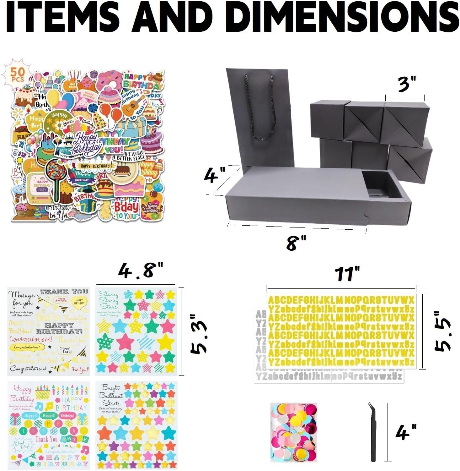 【 Extensive & Creative DIY Kit】:​​Comes complete with ​3 sets of sticker sheets​ (including 50 cute cartoon stickers, 2 gold/silver alphabet sticker sheets, and 4 decorative birthday stickers), plus ​dried flowers, colorful round confetti, and all necessary accessories​ (Tweezer/aid tool & tape) to decorate your surprise gift box uniquely