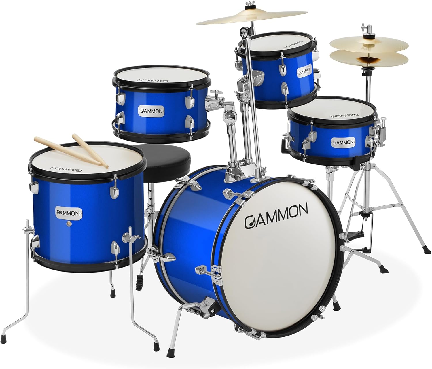 Gammon Percussion 5-Piece Junior Starter Drum Kit with Cymbals, Hardware, Sticks, & Throne - Blue