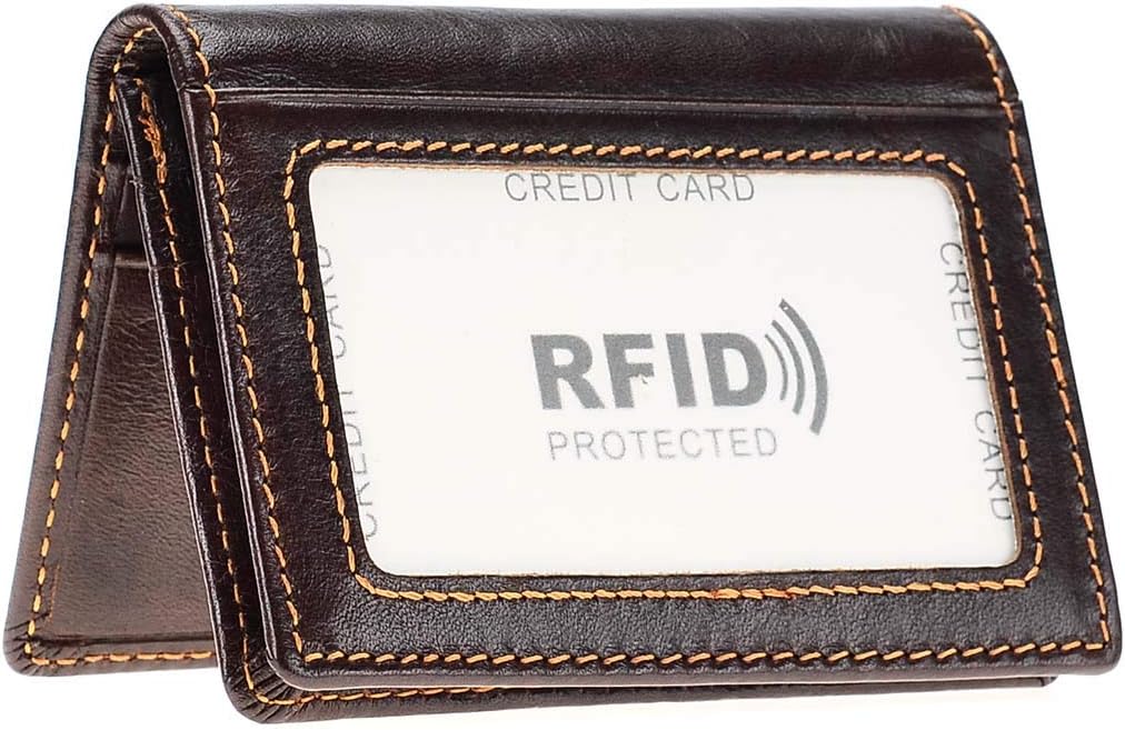 Wallet Specification Type: Bifold cards holder wallet for men; Material: Soft Genuine Leather/RFID card slots; Size: 10.5x7.7x1.5cm (4.13x3.03x0.59in), Weight: 40g(1.45oz); Structure: 4 Card Slots + 1 Clear ID Window +1 Cash/Note/Card Compartment; For men to sort out all the cards and change, perfect slide into the front or back pocket. Safe and Effective, Protect Your Identity Data This Men's Leather RFID Blocking Card Wallet is equipped with advanced unique military grade shielding technology & proprietary blocking material, which block RFID readers from scanning your credit cards, debit cards, banking Information, smart cards and other RFID Cards. Structures of wallet 5 x Card Holder; 1 x Cash/Note/Card Compartment; Package Includes 1 x Anti-theft Genuine Leather Card WalletTips to maintain the leather card wallet * Keep the card wallet in a dry, cool and ventilated place; * Avoid exposing to chemicals, spikes and hot place; * Cleaning with dry soft cloth when got stains.