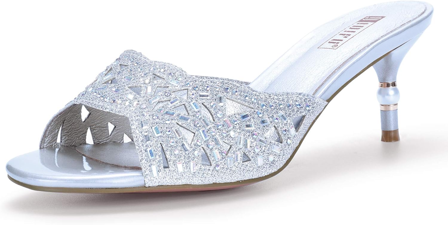 IDIFU Womens Silver Gold Wedding Shoes For Bride Bridesmaid Low Kitten Peep Toe Heels Dress Sandals Glitter Formal Slide Mules With Heel