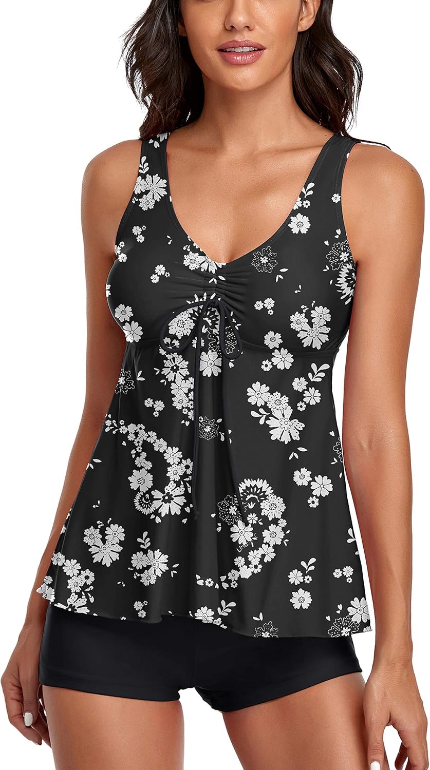 Omichic Modest Tankini Swimsuits for Women Two Piece Bathing Suits Floral Print Tank Top with Boyshorts