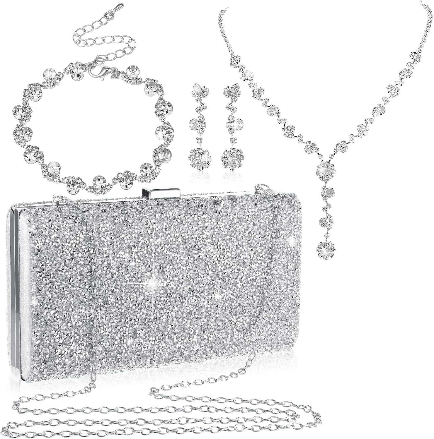 Mixweer 4 Pieces Clutch Purses Bag for Women Evening Rhinestone Jewelry Set Bling Necklace Earrings Bracelets Set for Wedding
