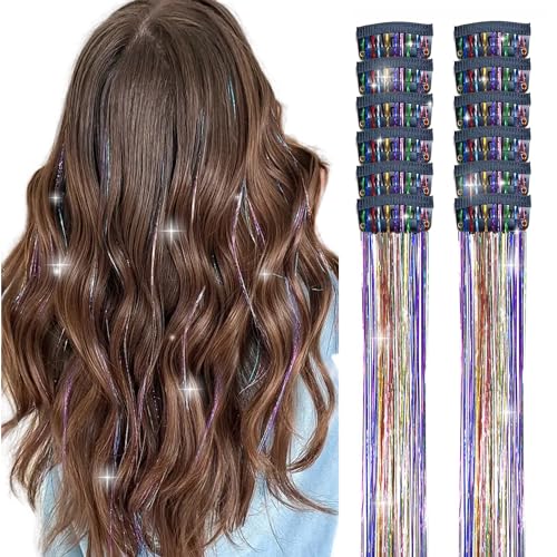 Hair Tinsel Clip in Pack of 12 Pcs Glitter Tinsel Hair Extensions 24 Inch Clip in Hair Tinsel Sparkly Fairy Hair Accessories for Girls Women Kids (Colorful)