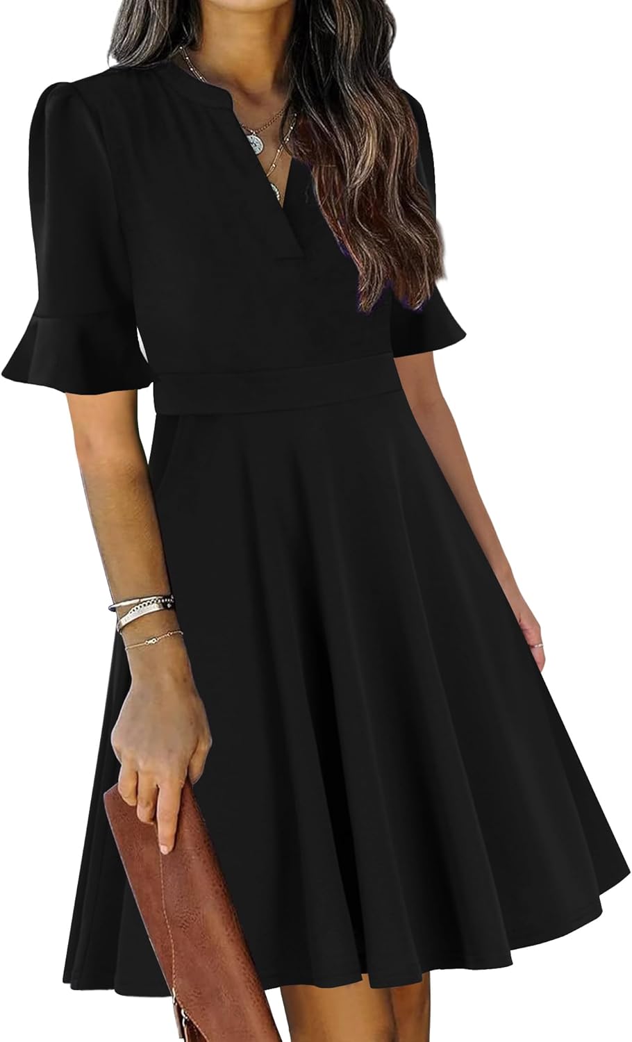Mokayee Womens Summer V Neck Ruffle Short Sleeve Fit and Flare Knee Length Church Wedding Guest Dresses with Pockets