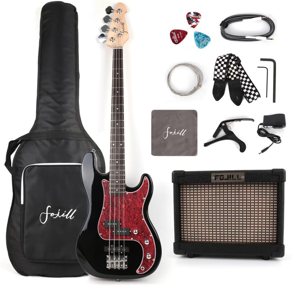 Fojill Full Size 4 Four String Electric Bass Guitar 10W Battery Power Amplifier Amp Right Hand Beginner Starter Kit Set Combo Bundle Accessory Gig Bag,Strap,Picks,Capo,Noiselss Cable,Strings