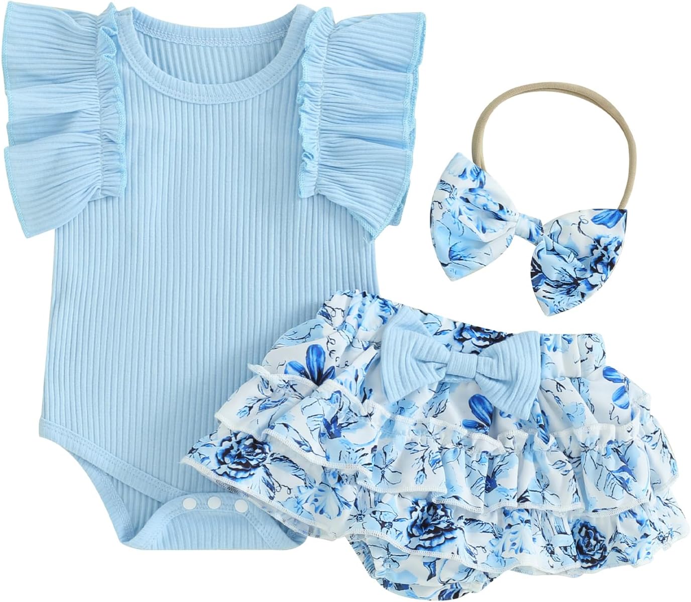 Kupretty Baby Girl Clothes Cute Summer Infant Outfits Ruffle Sleeveless Knit Romper + Floral Bow Bloomers Shorts + Headband