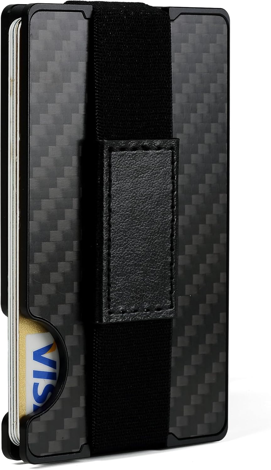 Wallet for Men, Slim Minimalist Carbon Fiber Wallet with Metal Money Clip/Cash Strap, RFID Blocking Aluminum Card Holder,Matte Carbon Fiber
