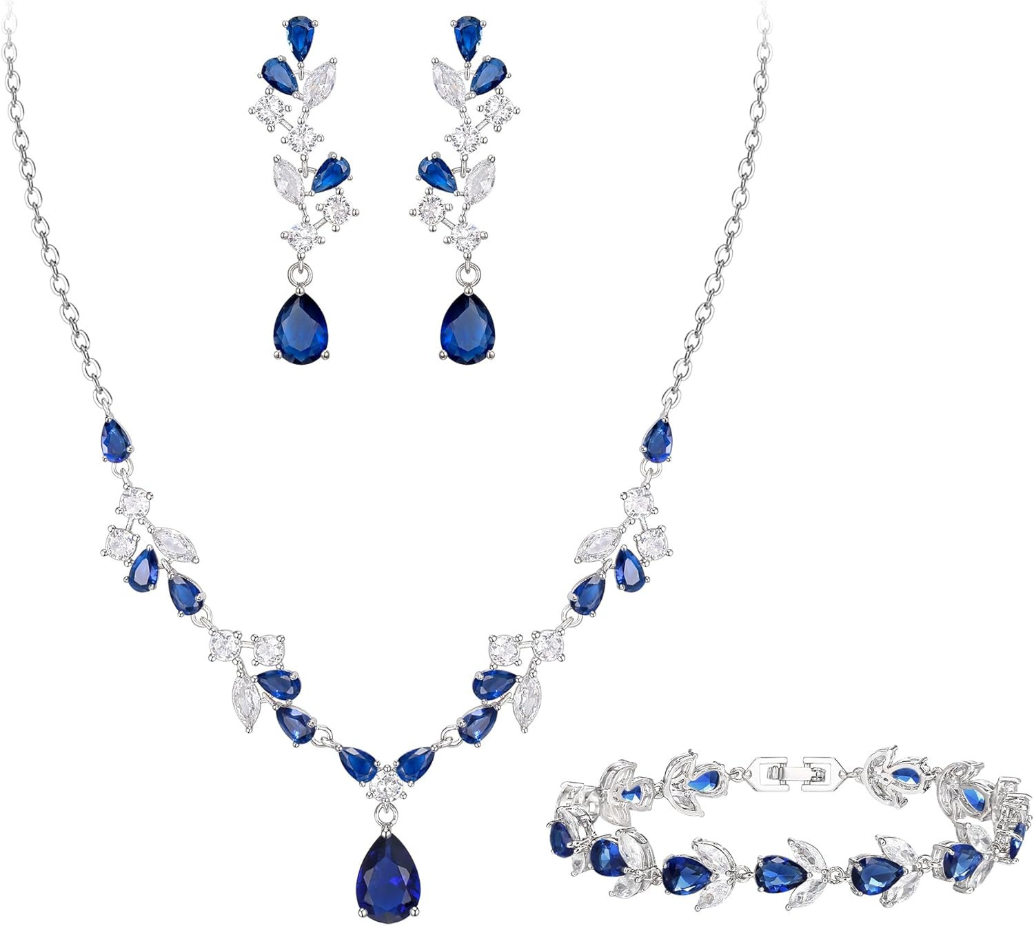 Crysdue Wedding Bridal Jewelry for Women Bridesmaid, Sparkle Teardrop Marquise Cubic Zirconia Y-Necklace Dangle Earrings Tennis Bracelet Elegant Prom Jewellery Set