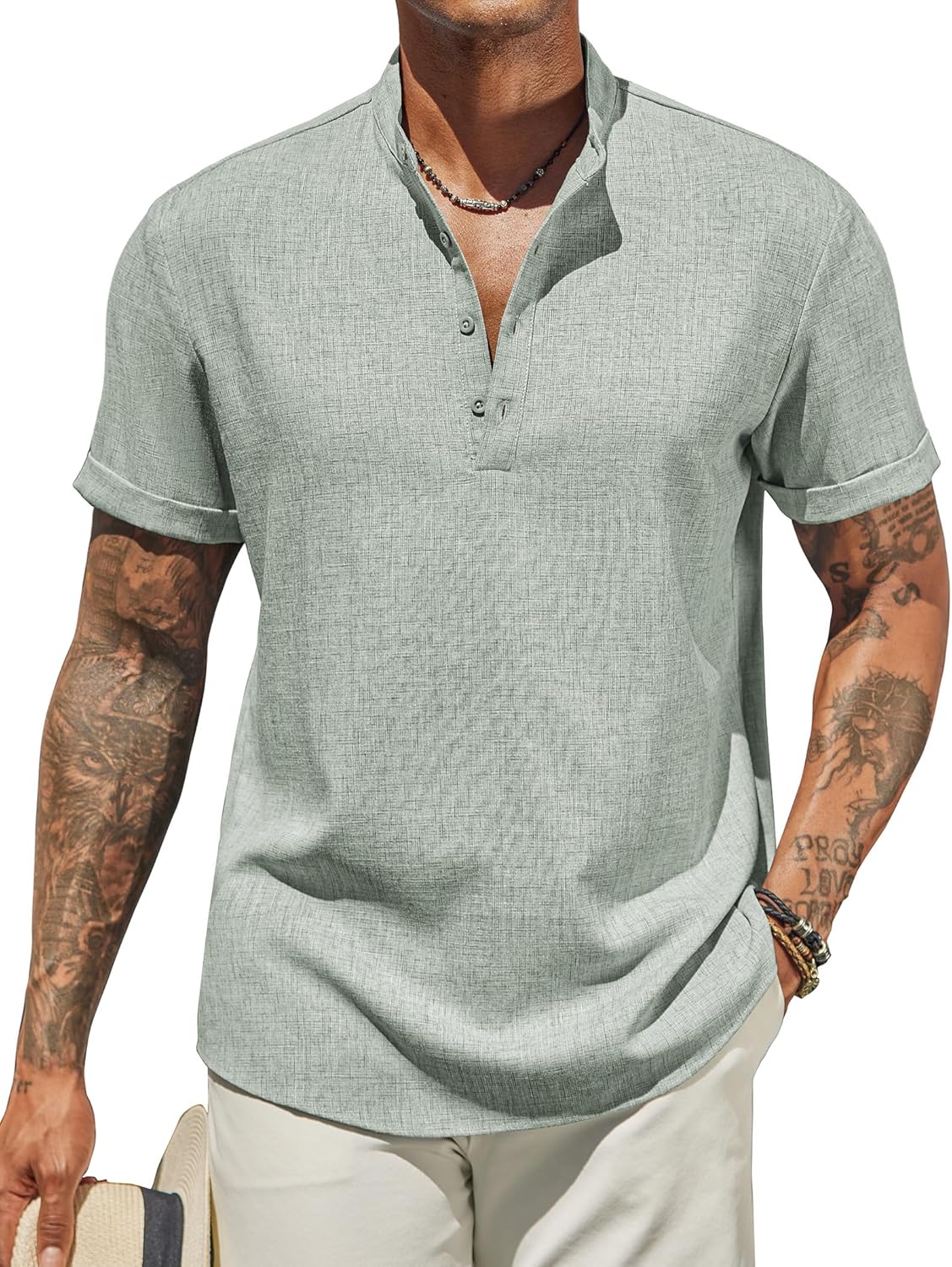 COOFANDY Men's Casual Linen Henley Shirts Short Sleeve Band Collar Summer Beach Vacation T-Shirts