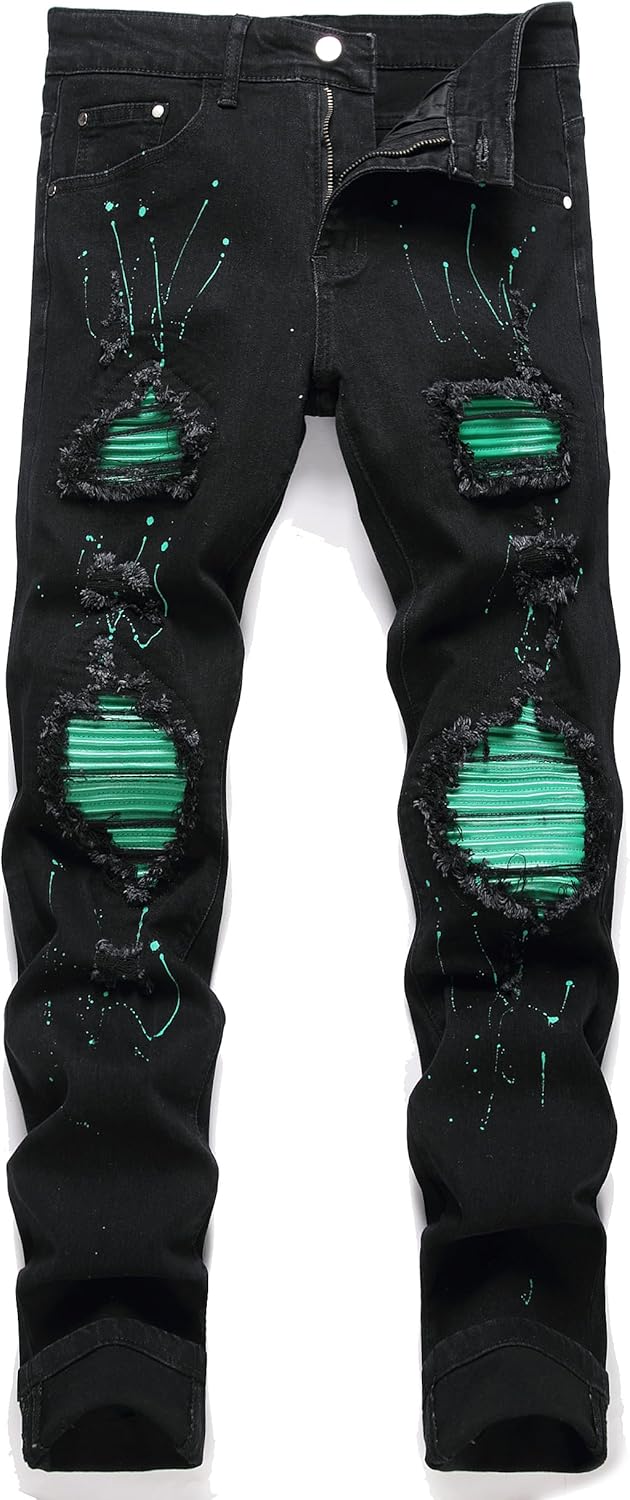 Men's Ripped Patch Elastic Jeans Fashion Slim Fit Regular Denim Pants