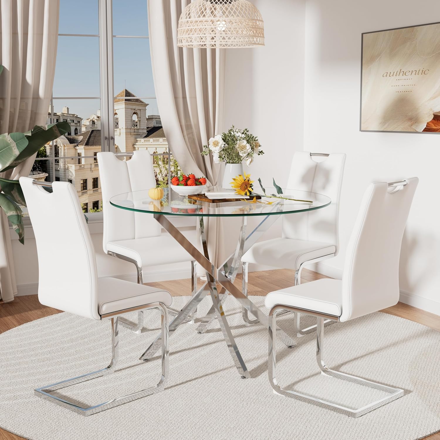 RGZ 5 Piece Luxury Round Dining Table Set, 36'' Modern Circle Kitchen Set for 4, 4 Person Clear Glass Circular Top Dinner Room Set, White PU Faux Leather Chairs, for Small Place (Silver)