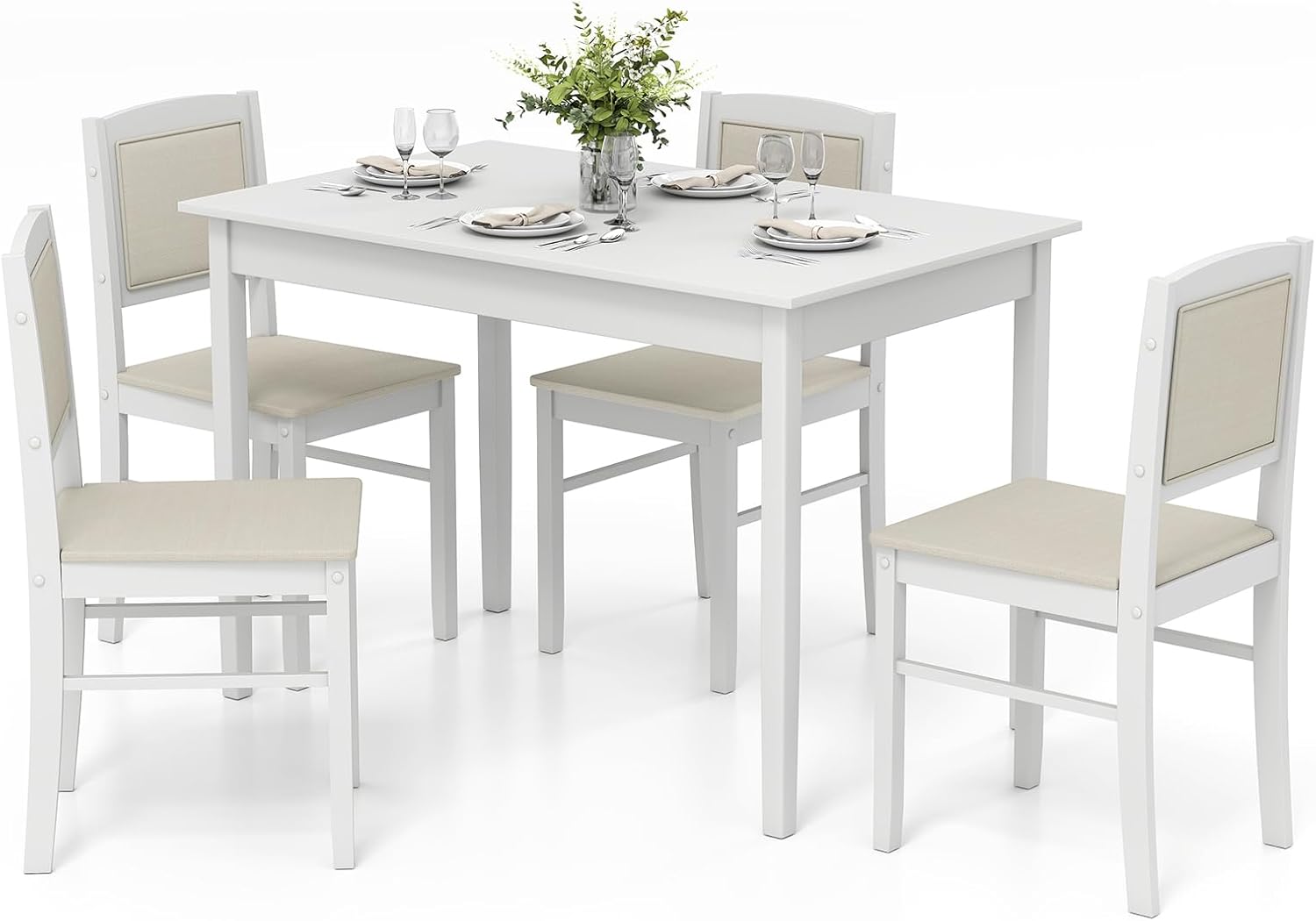 Tangkula Dining Table Set for 4, Farmhouse Solid Wood Dinette Set w/Rubber Wood Legs, Upholstered Seat & Padded Backrest, Mid-Century Modern Dining Table and Chairs Set for Kitchen, Dining Room