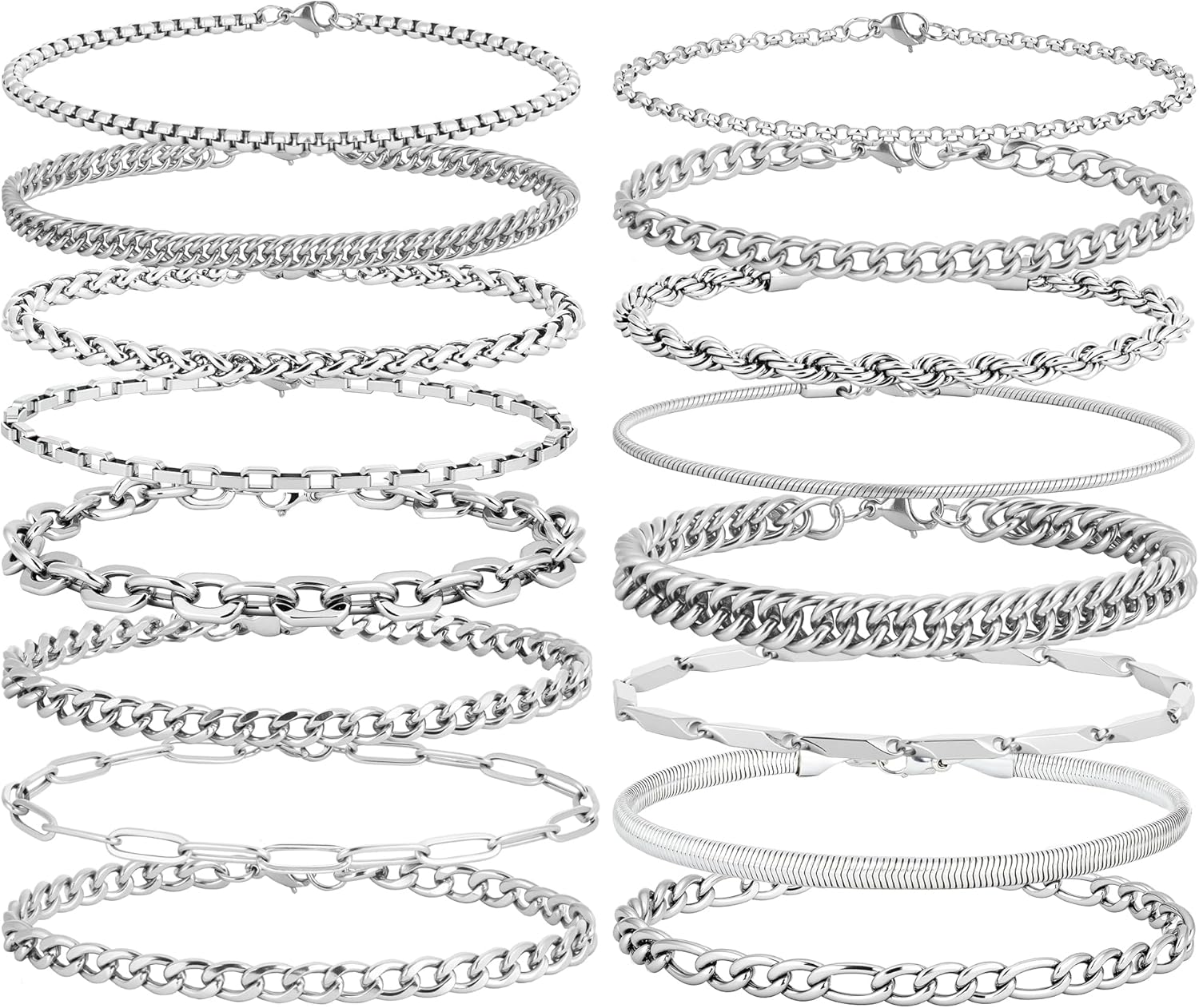 ELLEWIN Chain Bracelet for Men Stainless Steel Cuban Link Curb Figaro Herringbone Rope Paperclip Snake Byzantine Curb Chunky Chain Silver Bracelets Jewelry Set for Men 8.3 Inches