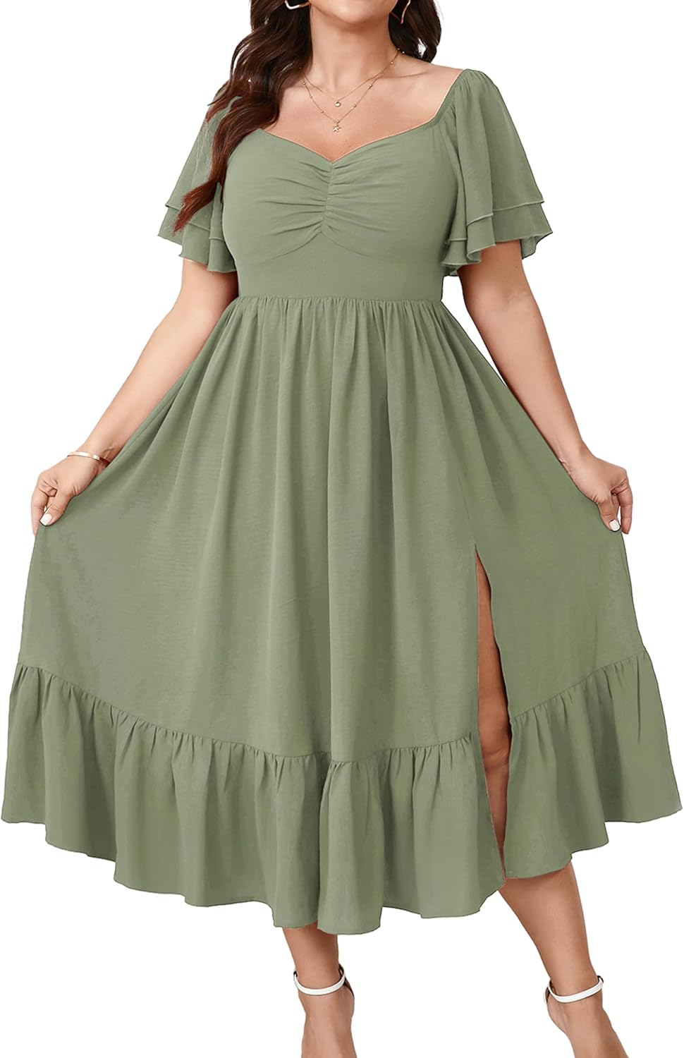 SCOMCHIC Womens Plus Size Wedding Guest Cocktail Dresses Sweetheart Neckline Short Sleeve Smocked Ruffle Slit Maxi Dress
