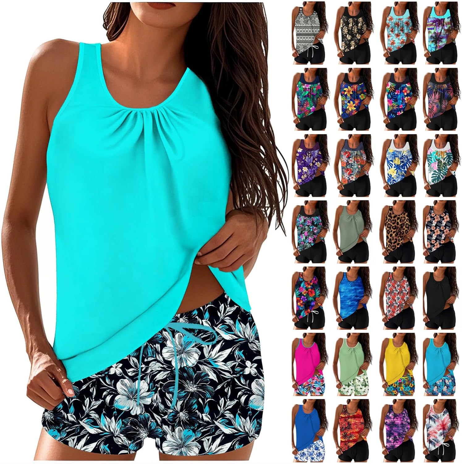 Women's Tankini Swimsuits Tummy Control Two Piece Bathing Suits Blouson Swim Tank Top with Boyshorts Modest Swimwear