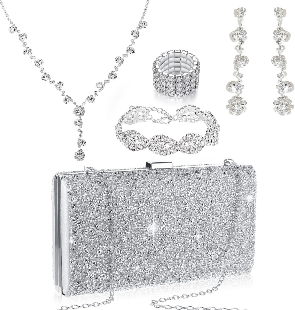 Silver Clutch Purse Prom Crystal Jewelry Accessories Set for Women Wedding Dressy Evening Party