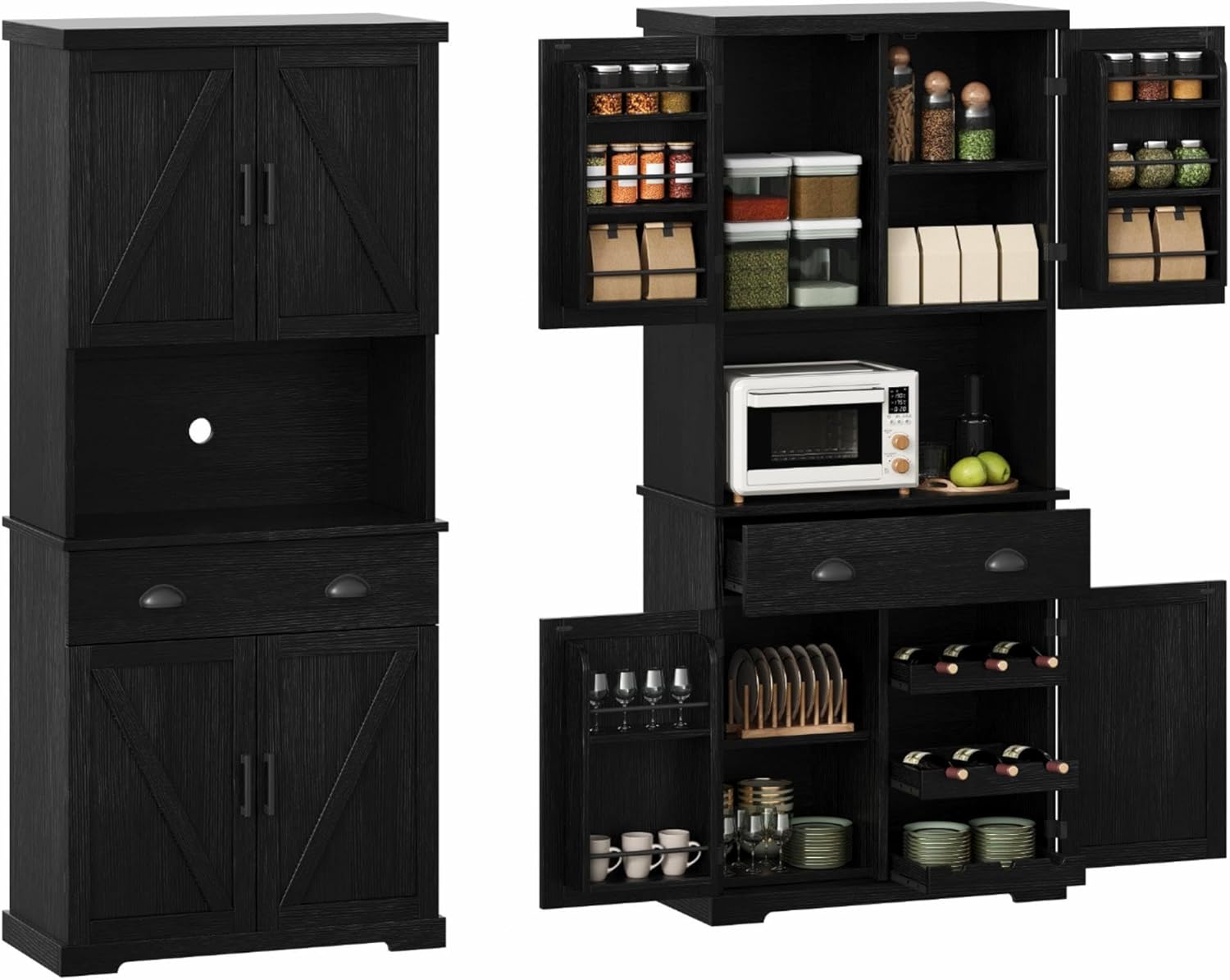 【Ample Storage Space】This 72" tall kitchen pantry cabinet features a fixed and 2 adjustable shelves for customizing storage. 8-door shelves are suitable for spices, small jars, and more. A microwave rack and a drawer are located in the center for added more storage space