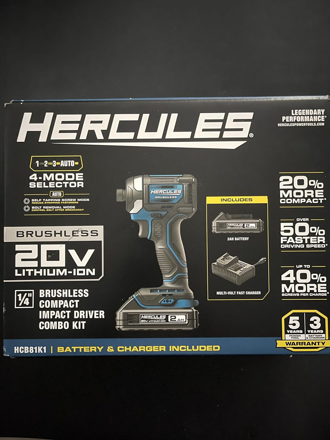 HERCULES 20V Brushless Cordless, 1/4 in. Compact 3-Speed Impact Driver Kit with 2 Ah Battery and Charger