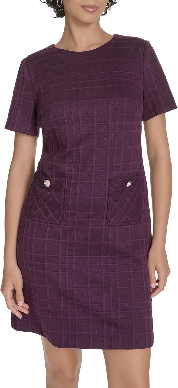 This Tommy Hilfiger Women's Dresses Shift is a Short Sleeves Knitted Power Grid Pockets Th Logo Crest Buttons Round Neck